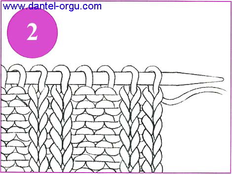 2 ilmek ters örgü yapıyoruz .İpiliğimizi kendimize çeviriyoruz, şişi ilmeğin ortasından kendimize doğru batıp ipliği üzerine dolayıp çıkarıyoruz